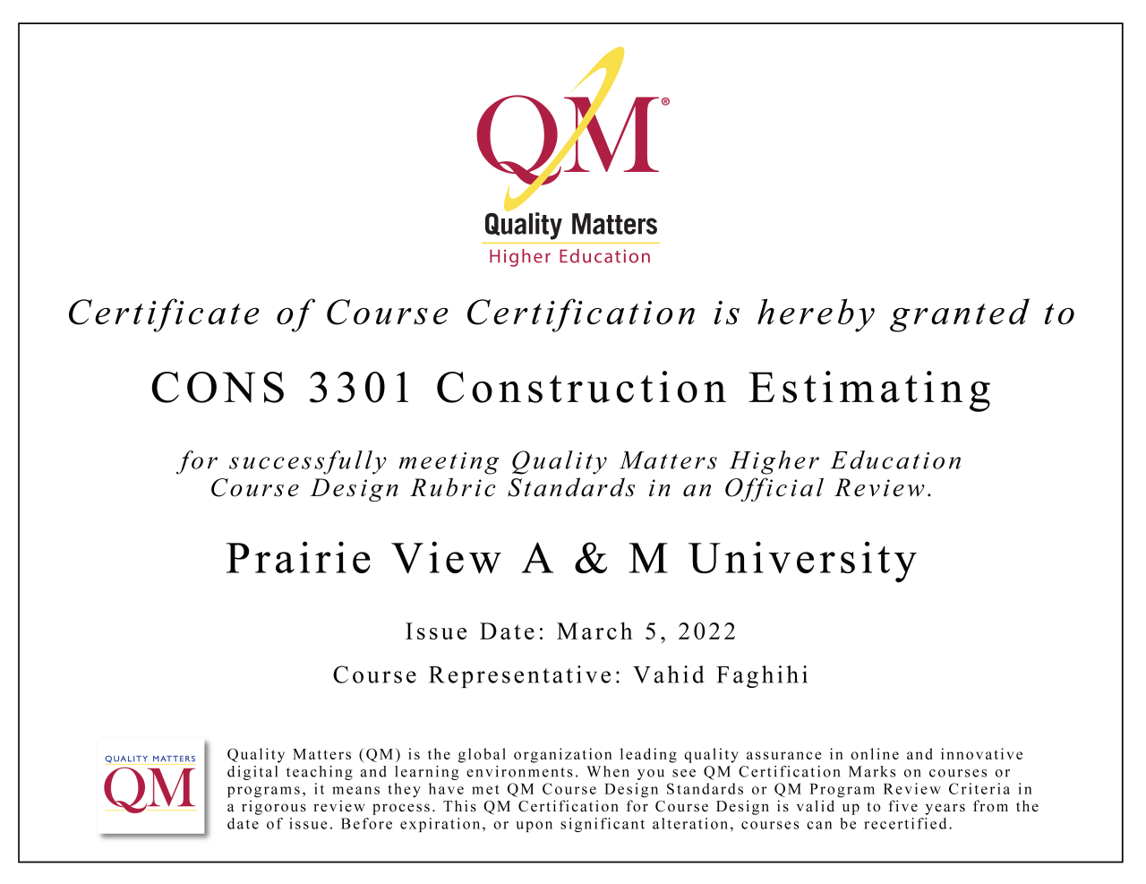 Quality Matters Certificate - CONS3301: